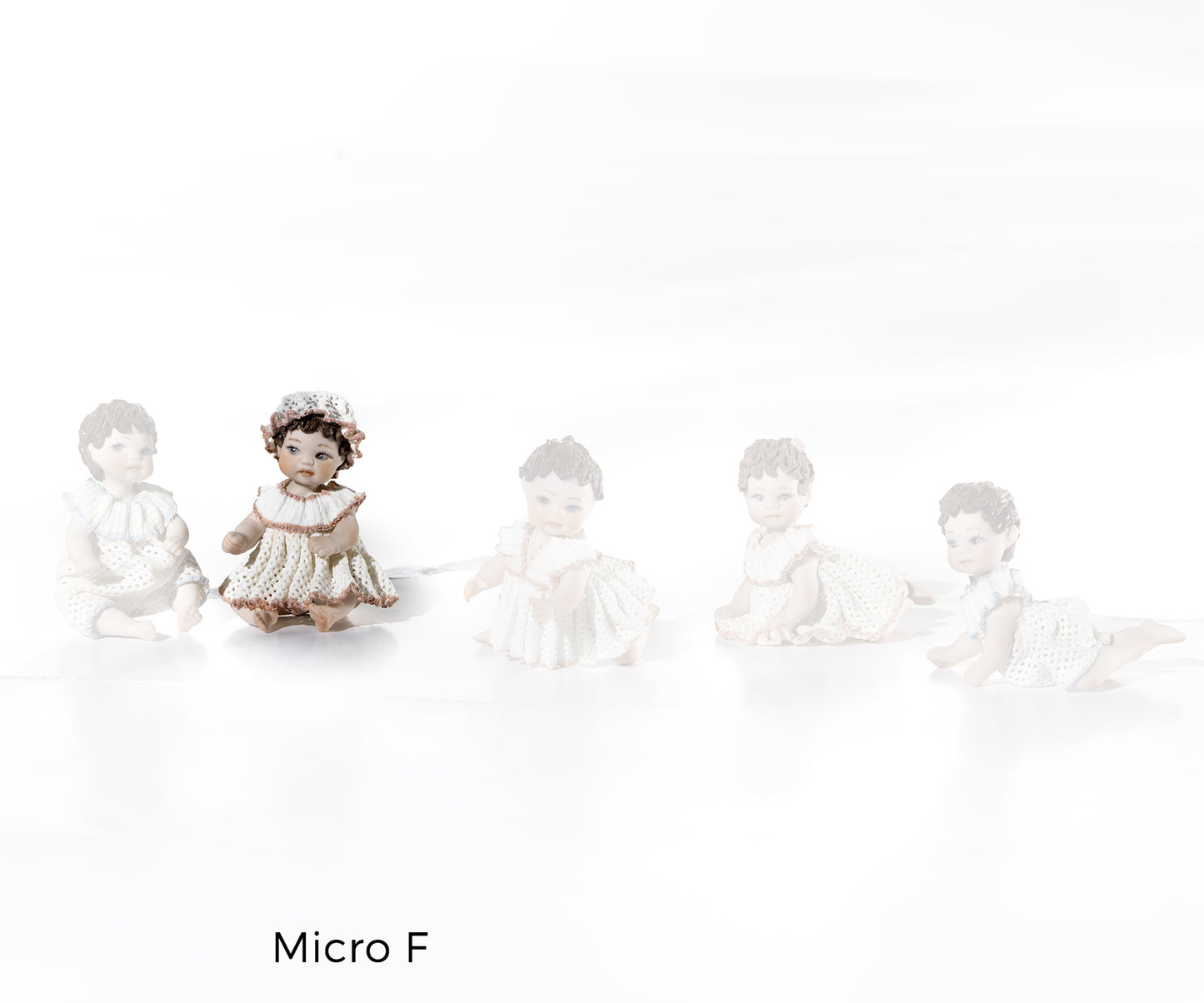 Figura in porcellana raffigurante un neonato seduto a terra. Indossa una tutina in tulle con bavero a righine, bordato di azzurro.