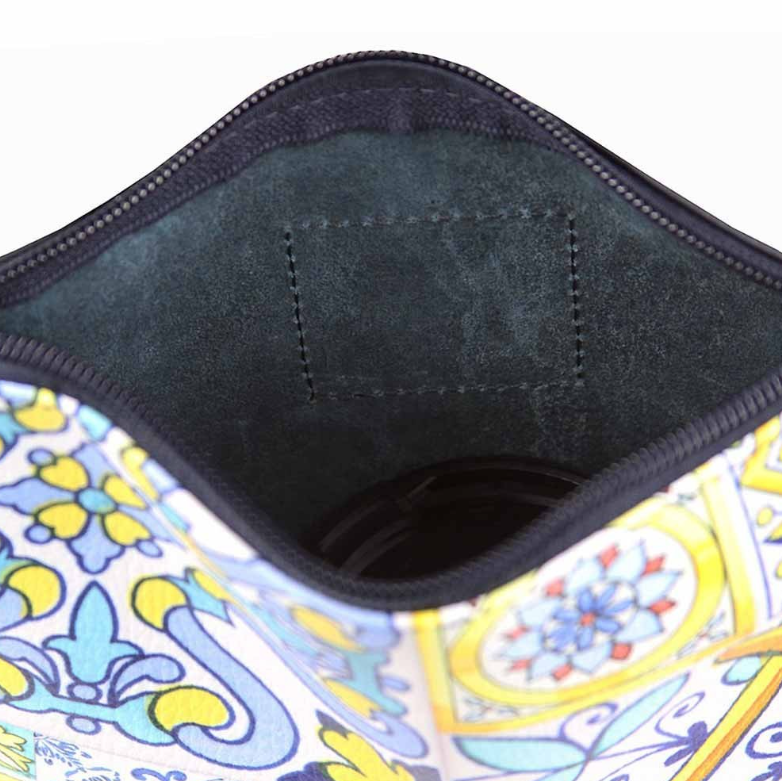 La Pochette Donna Amalfi della linea Capricci diMacrì è un omaggio al luogo da cui prende il nome. Che bella Amalfi! Limpide acque lambiscono una costa baciata dagli dei. Qui la natura si fa madre offrendo i suoi doni con opulenta generosità. Da un ripido pendio con le pittoresche case disposte su gradini a sbalzo fino alla profondità delle sue acque. Pura magia.